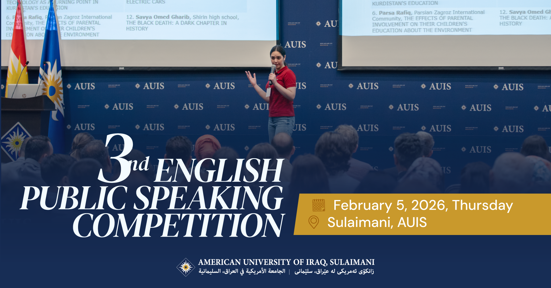 AUIS is proud to be building new academic traditions and hosting the 3rd annual English Public Speaking Competition for high school students. This competition is designed to provide students with a platform to showcase their English language skills and public speaking abilities. It is also an opportunity for AUIS to contribute to the professional development of English language teachers in the region since AUIS has a longstanding commitment to community engagement, particularly through providing professional development training for teachers in collaboration with local and regional schools.